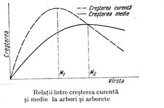 In silvicultura se vorbeste de cresterea curenta produsa intr-un an si de crestere medie ce rezulta din impartirea cresterii pe un interval de timp la numarul de ani din acea perioada(figura 5.7.).