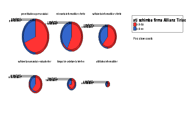 In graficele de mai sus s-a analizat interdependenta dintre gradul de satisfactie cu privire la elementele mentionate si dorinta clientilor de a schimba firma Alianz cu o alta firma de asigurari. Precizand ca partea rosie reprezinta persoanele care au raspuns afirmativ la intrebarea “Ati schimba firma Allianz Tiriac Asigurari Auto pentru o alta?” observam cap proportia acestora este ingrijoratoare (mai mult de 50 la %)