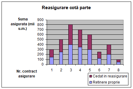 Presupunand ca, in cazul asigurarilor de cladiri, reasiguratul stabileste retinerea proprie la suma de 40 milioane lei la fiecare din contractele de asigurare, in diferent ca acestea ar fi de 100, 150 sau 200 de milioane lei, excedentul de suma asigurata va fi de 60, 110 si 160 de milioane lei. Daca un reasigurator accepta sa preia 10% din excedent, el va prelua: 6 milioane, 11 milioane si 16 milioane lei.