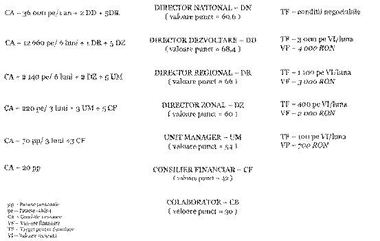 Director Regional (DR): acumularea a 2 140 de puncte cu echipa in ultimele 6 luni si coordonarea a 2 Directori Zonali (DZ ) si 5 Unit Manageri (UM) in linie directa. Pe acest nivel valoarea unui punct este de 66 Ron.