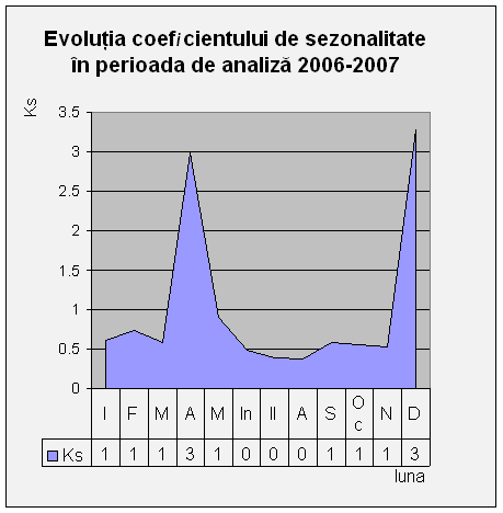 Din datele furnizate de tab. nr.2 " situatia vânzarilor lunare din produsul K ", din calculul ulterior al coeficientului de sezonalitate si reprezentarea lui grafica, din reprezentarea în coordonate polare a CA medii lunare în perioada de analiza a fost identificat produsul K ca fiind produsul de panificatie cu denumirea " cozonac ". Acesta concluzie fiind datorata gradului accentuat de sezonalitate a acestuia în lunile aprilie si decembrie - perioade de sarbatori religioase în care consumul acestui produs reprezinta o traditie în România.