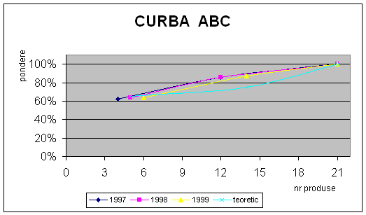 Din analiza CA pe produs cu ajutorul metodei ABC si din cerba ABC trasata rezulta ca curba pentru anul de calcul se gaseste sub cea din anul de baza, având o usoara tendinta de suprapunere pentru ultimele 5 produse, dar totusi ambele curbe se afla deasupra curbei teoretice, care este considerata ideala pentru activitatea analizata.