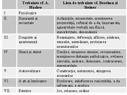 TIPURI DE TREBUINŢE. Pornind de la piramida trebuintelor a lui A. Maslow, Berelson si Steiner au alcătuit propria lor listă de trebuinte (adaptând-o pe cea initială):