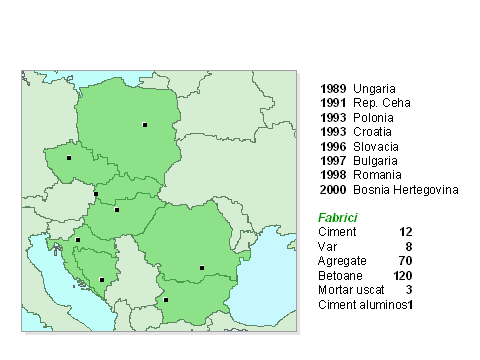 Investitiile au început în 1989 în Ungaria, urmate de cele în Republica Ceha, Polonia si Croatia. Procesul de consolidare a fost continuat prin patrunderea pe noi piete în Bulgaria si România în 1997 si respectiv 1998. Cel mai recent pas a fost facut la sfirsitul anului 2000 prin achizitionarea fabricii de ciment de la Kakanj din Bosnia Herzegovina .