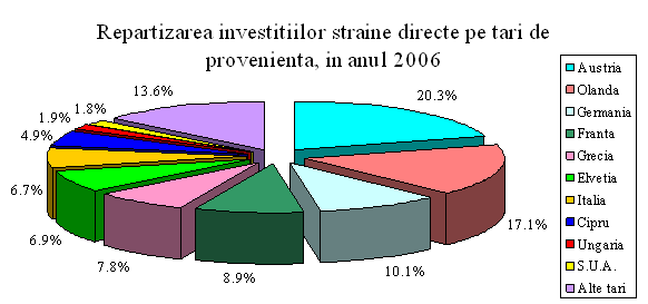 Primele cinci tari clasate în functie de ponderea detinuta în soldul investitiilor straine directe la 31 decembrie 2006 sunt: Austria (care detine o pondere de 23% din total, cu o crestere semnificativa a ponderii fata de anul 2005 când detinea 15% din soldul investitiilor straine directe în România), Olanda (17,1% în anul 2006, în scadere ca pondere, de la 19,5% în anul 2005), Germania (10,1%) si Franta (8%) care îsi mentin ponderile comparativ cu anul 2005, Grecia (7,8%, pondere în scadere usoara fata de anul 2005).
