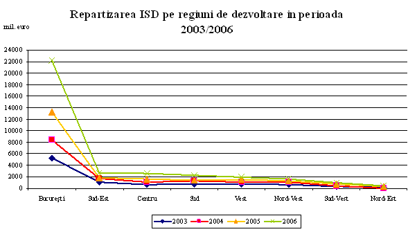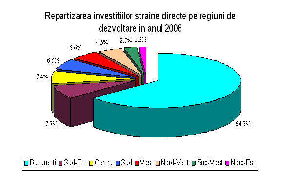 Se constata ca în perioada analizata cea mai mare parte a investitiilor straine directe a fost localizata în regiunea de dezvoltare Bucuresti (54,2% în 2003 - 64,3% ,n 2006 din total investitii straine directe). Bucurstiul a atras peste 60% din investitiile straine directe, fiind atractiv pentru cei mai multi investitori straini, datorita faptului ca este capitala tarii si beneficiaza de o infrastructura adecvata (de transport, telecomunicatii, sedii de firma, spatii de productie si depozitare), de forta de munca bine calificata. Pozitia a doua este ocupata de regiunea de dezvoltare Sud-Est prin investitiile realizate în special în judetele de la malul Marii Negre. Cele mai reduse investitii straine directe au fost localizate în perioada analizata în regiunea Nord-Est, aceasta fiind o zona saraca din punct de vedere al resurselor materiale, al infrastructurii, dar si al fortei de munca îmbatrânite (ca urmare a migratiei masive a fortei de munca tinere în alte regiuni ale tarii sau în strainatate). O alta explicatie este aceea ca în aceste regiuni, numeroase proiecte de investitii au fost realizate de la zero, din cauza lipsei sau insuficientei infrastructurilor specifice mediului economic.