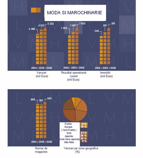 Grupul moda si marochinarie inregistreaza in 2006 o crestere a vanzarilor de 11% si o progresie de 11% a rezultatului operational curent. Marcile de moda si marochinarie investesc foarte mult pentru a dezvolta prezenta lor in lume: reteaua mondiala de distributie a grupului este reprezentata de 954 magazine pe data de 31 dec 2006.