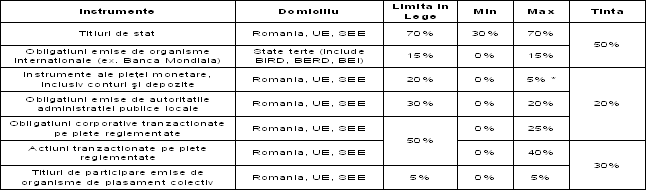 R: Structura de active propusa este de 70% instrumente cu venit fix si 30% actiuni. Instrumentele cu venit fix vor include titlurile de stat, obligatiuni corporative, obligatiuni emise de autoritatile locale, instrumente ale pietei monetare inclusiv depozite si numerar . Investitiile in actiuni, initial, se vor face numai pe piata locala.