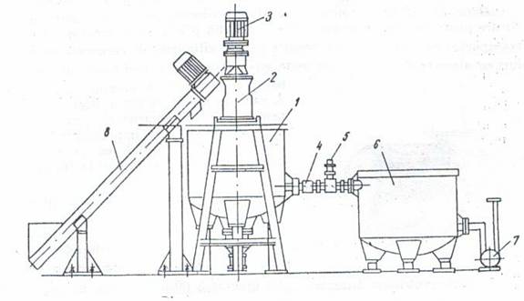 Dizolvatorul cu agitator reprezinta o constructie alcatuita din doua vase, unul pentru dizolvare (1) si aluatul colector (6), care comunica intre ele printr-o conducta (4) cu robinet (5). In vasul de dizolvare se afla agitatorul mechanic (2) actionat de la motorul electric (3). Pentru filtrarea solutiei, conducta de legatura a celor doua vase dispune de filter.