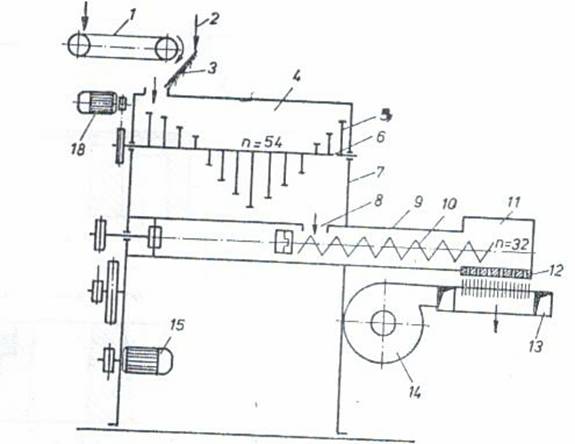 In interiorul cuvei de framantare se afla paletele de amestecare (5) dispuse elicoidal pe axul (6). Datorita miscarii axului, paletele amesteca materiile introducandu-le in cuva si in acelasi timp, le deplaseaza treptat spre capatul (7) al cuvei, de unde, prin orificiul (8), ajung in cilindrul de presare (9). Melcul de presare (10) transporta, compactizeaza si preseaza aluatul in camera de omogenizare a presiunii (11), de unde este distribuit uniform pe suprafata matritei, este usor zvantat cu ajutorul unui jet de aer directionat de distribuitorul (13) si primit de la ventilatorul (14). Actionarea se face prin motoarele electrice (15) si (16).