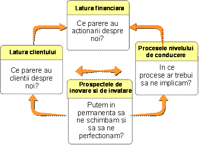 Procesele de evaluare sunt gandite in asa fel incat sa realizeze focalizarea angajatului pe aceste 4 mari zone de dezvoltare (acestea fiind infapt o redistribuire a cadranelor deja analizate: (Financiar, Clienti, Procese Interne - conducere, Inovare si Invatare