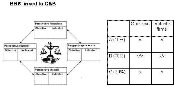 Dupa cum am mentionat, factorii critici de succes si indicatori specifici sunt definiti pentru fiecare cadran prezentat. Graficul de mai jos prezinta schematic modul in care se realizeaza corelarea la nivel strategic intre BBS si sistemul de compensatii si beneficii.