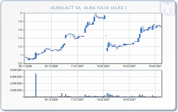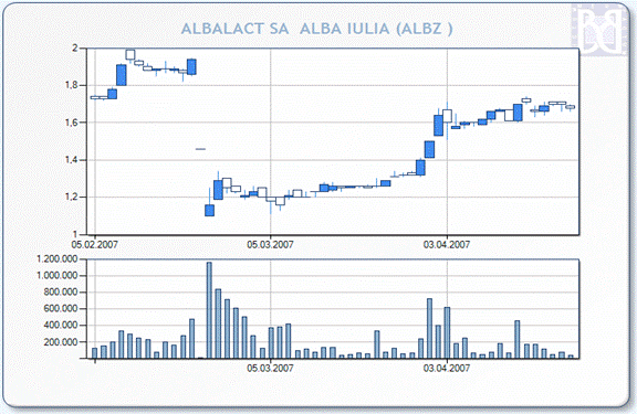 Acest tip de grafic ne ofera câteva informatii în plus fata de cel anterior prezentat, si anume faptul ca în momentul caderii de curs din luna februarie nu au existat tranzactii cu actiunea respectiva. In perioada de la sfârsitul lunii februarie a avut loc majorarea capitalului Albalact.