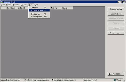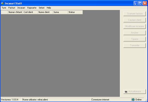 Dupa ce se va autentifica in sistem operatorul se va afisa pagina principala a modulului de incasari unde vor aparea, daca este cazul, toate incasarile netransmise inca catre Billing