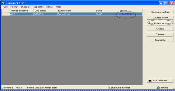 De asemenea, aceste incasari netransmise au un status: "Transmis", "Netransmis", "De transmis", care vor indica operatorului daca plata a fost sau nu transmisa catre Biling. O plata poate fi modificata numai daca are statusul "Netransmis". Cand se doreste modificarea unei incasari se selecteaza din pagina principala chitanta al carei status este "Netransmis".