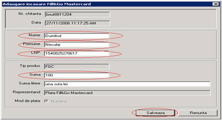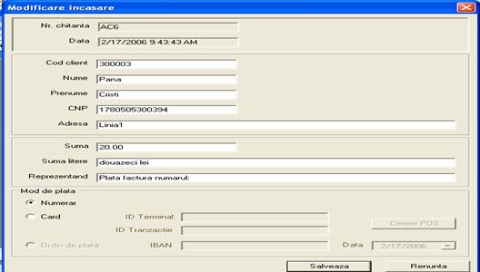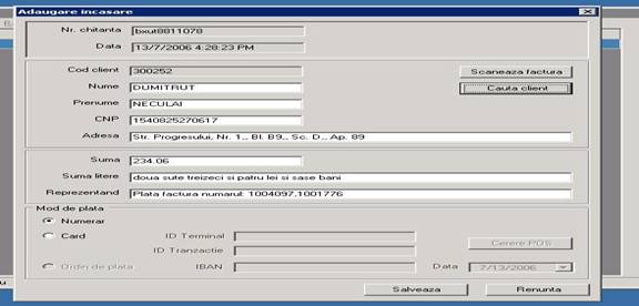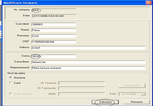 Se introduc Numele, Prenumele si CNP-ul clientului. La "Suma" se introduce plata pe care doreste clientul s-o efectueze, introducand suma in cifre. Suma in litere va fi completata automat de aplicatie. Pentru a inregistra plata, alegem butonul "Salveaza".