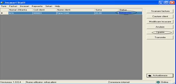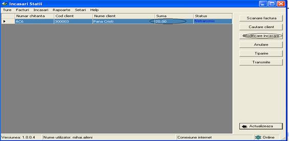 Dupa salvare se revine in ecranul principal, unde incasarea apare ca netransmisa.