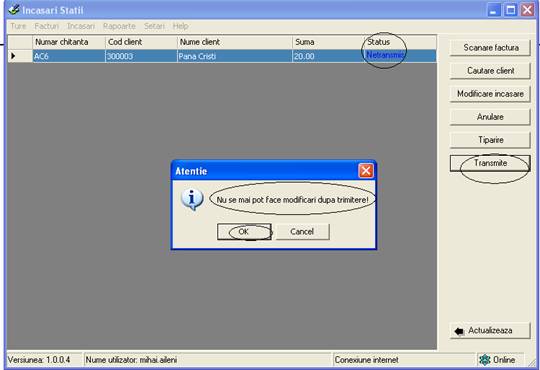 Urmatorul pas este transmiterea incasarii in Billing. Pt aceasta se apasa butonul Transmite. Se apasa OK pt a confirma casuta de dialog.