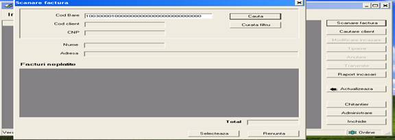 Se selecteaza butonul de "Scanare factura" pentru a scana o factura. Apoi, fie trebuie scanata factura fie trebuie introdus codul de bare in cazul in care cititorul nu functioneaza sau in cazul in care clientul a pierdut factura vom cauta clientul dupa codul de client sau dupa CNP si vom alege butonul "Cauta". Dupa ce scanam factura sau dupa ce introducem codul de bare ne vor aparea toate detaliile financiare legate de facturile respectivului client sau despre factura al carui cod de bare a fost scanat.