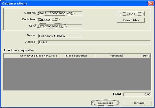 Atunci cand clientul nu prezinta factura din diferite motive dar doreste sa-si achite o factura eliberata pe numele sau in contul sau, va trebui sa cautam clientul respectiv in baza de date pentru a vizualiza detaliile financiare legate de o eventuala factura. Pentru a realiza acest lucru vom selecta din pagina principala butonul "Cautare client". Se vor introduce datele disponibile in campurile de cautare "Card NO", "Cod Client", "CNP" apoi se va alege butonul "Cauta". Odata selectat acest buton ni se vor afisa toate informatile financiare despre facturile clientului respectiv si totalul de plata.