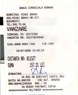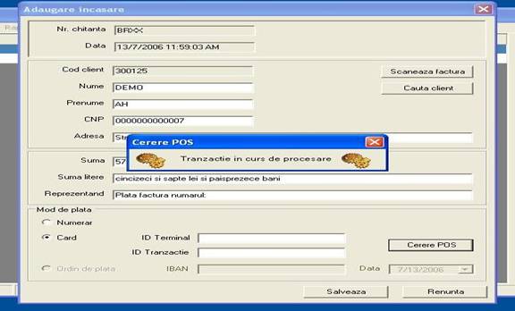 Dupa ce se verifica datele de facturare si cardul clientului (conform procedurilor de verificare card bancar) se selecteaza mod de plata card. Atuci cand se selecteaza butonul "Card" se va activa automat butonul Cerere POS. Se apasa butonul Cerere POS, dupa care pe ecran va aparea "Tranzactie in curs de desfasurare", in timp ce pe POS va aparea suma introdusa, si se va astepta introducere card client, urmata de cod-ul pin al cardului.