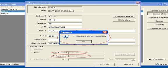 Daca tranzactia de pe POS nu se incheie cu succes (refuz plata), mesajul de pe ecran va fi "Tranzactie offline" si se selecteaza "Renunta". Altfel se vor completa automat campurile ID Terminal su Id Tranzactie, si va aparea mesajul "Tranzactie efectuata cu success".