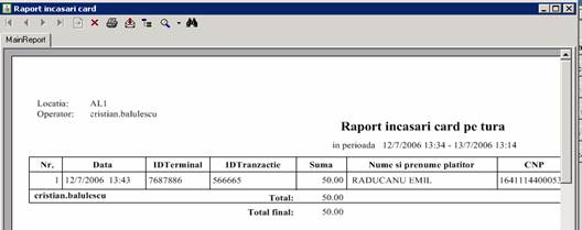 Functionalitatea acestor rapoarte este relevanta pentru a verifica incasarile zilnice efectuate de catre agentii logati. Raportul, odata listat, va putea fi printat sau salvat pe PC in format Adobe.