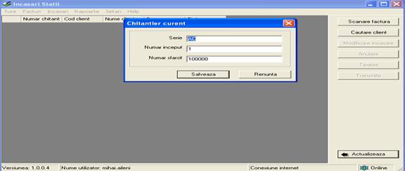 Butonul de chitantier ne ajuta setarea chitantierului, astfel incat sa existe o corespondenta exacta intre filele chitantelor tiparite si cele din modulul de incasari. Dupa setarea unui nou chitantier se alege butonul "Salveaza" pentru salvarea informatiilor.