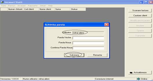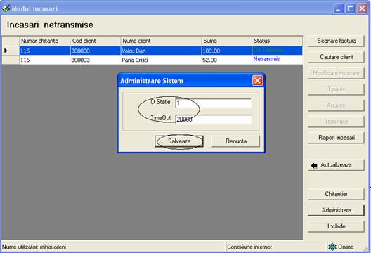Actualizare : Acest buton transmite incasarile cu statusul "De transmis" din modulul de incasari catre Biling. Toate incasarile cu acest status vor disparea din modulul de incasari. Este de preferat sa selectati acest buton la intervale repetate atunci cand incasarile raman cu statusul "De transmis". Totodata, verificati daca sunteti sau nu conectati la reteaua de internet avand in josul paginii statusul "Online"