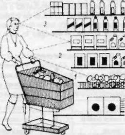 - produsele trebuie dispuse la diferite înaltimi, ceea ce da o impresie de relief si evita caracterul fix sau monoton. Ele trebuie sa se situeze la trei niveluri de înaltime si de profunzime. Aceasta dispunere da un sentiment de perspectiva, iar vitrina devine mai animata. Este necesar ca fiecare vitrina sa faca apel la toate resursele tehnice pentru ca decorul, articolele, culorile si punerea lor în spatiu sa atraga din partea fiecarui trecator atentie, întelegere, memorizare si credibilitate maxime.