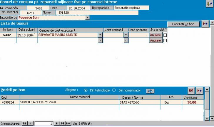 Macheta permite editarea īn format electronic a bonurilor de consum pentru materiale si piese de schimb destinate īntretinerii si reparatiei mijloacelor fixe īn service-ul unor centre de cost.