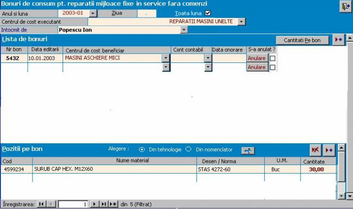 o Editarea īn format electronic a unui bon de consum materiale utilizate pentru asigurarea functionalitatii centrelor de cost. Materialele cerute pe bon vor trebui legate de un tip de cheltuiala :