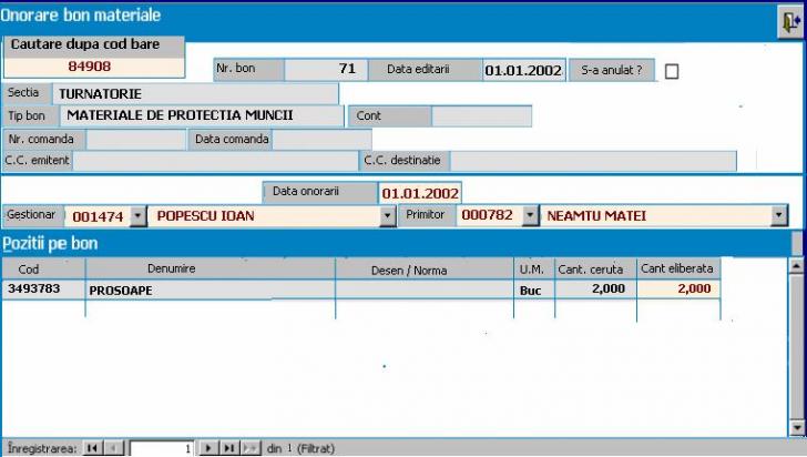 Materialele cerute pe un bon de consum (pozitiile pe bon) se aleg din nomenclatorul tehnologic cu posibilitatea de a vedea cantitatile existente īn stoc. Un material nu poate fi cerut pe bon daca nu exista cantitativ īn gestiune iar cantitatea solicitata se retine timp de 48 de ore pentru solicitant.