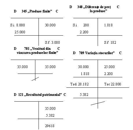 In cursul lunii, s-au obtinut produse finite la pret prestabilit de 25.000 lei si s-au vandut produse finite la cost prestabilit de 30.000 lei, pret de vanzare de 35.000 lei, urmand a se emite factura ulterior.