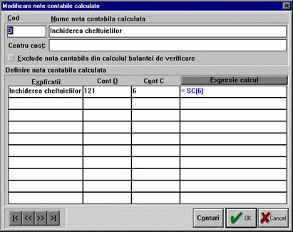 În a doua parte a ferestrei de dialog se scrie înregistrarea contabila pe care doriti sa o înregistrati. Se scriu conturile în care doriti sa faceti înregistrari pe coloanele "Cont D" si "Cont C" în functie de înregistrarea contabila. Pe coloanele "Suma D" si "Suma C" se scriu valorile ce trebuiesc înregistrate în conturile respective.