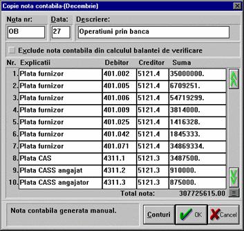 Dupa ce ati terminat de completat câmpurile din aceasta fereastra de dialog, apasati cu mouse-ul butonul "OK" sau apasati tasta "Enter". Programul va înscrie în baza de date aceasta înregistrare si automat va deschide o noua fereastra de dialog ce are completate câmpurile pâna la "Inregistrare contabila" cu informatiile introduse anterior. Parcurgeti câmpurile folosind tasta "Tab" si modificati informatiile din câmpuri doar unde este necesar.