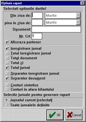 Raportul "Registrul jurnal" realizeaza afisarea tuturor înregistrarilor contabile care s-au facut într-un jurnal, afisând totodata si articolele contabile folosite. La selectarea acestei optiuni este afisata fereastra de dialog din Figura 77.