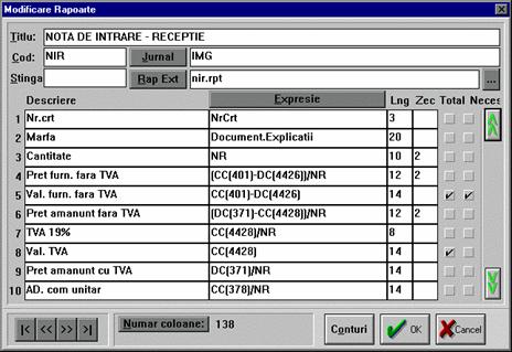 Pe aceasta linie am configurat a opta coloana a raportului. Coloana se va numi "Baz. imp 19%" si va contine valoarea fara TVA deductibila a documentelor ce apar în raport. Expresia ce va calcula valoarea totala este: "CC(401)+CC(404)+(CC(5311)+CC(542))*SDC(4426)-DC(4426)-TAXA". În aceasta expresie am adunat sumele înregistrate în creditul conturilor 401 (furnizori), 404 (furnizori de imobilizari), 5311 (casa în lei) numai înregistrarile care au TVA deductibila, 542 (avansuri de trezorerie) numai înregistrarile care au TVA deductibila, din care am scazut TVA-ul (DC(4426)) si "TAXA" (valoarea taxei de drum). Am eliminat sumele înregistrate în creditul conturilor 5311 si 542 atunci când nu sunt purtatoare de TVA, prin înmultirea acestora cu expresia "SDC(4426). "În câmpul "Lng" am trecut valoarea "14", adica o latime a coloanei de paisprezece caractere. Am bifat câmpul din coloana "Total" pentru a obtine în raport totalul bazei de impozitare.