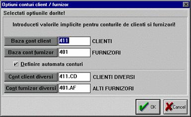 Pentru ca programul sa creeze automat conturi analitice pentru partenerii introdusi, apelati comanda "Clienti/furnizori" din meniul "Optiuni". Pe monitor apare o fereastra de dialog ca în Figura 74.