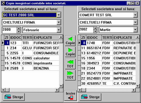 Cu acest utilitar puteti copia datele introduse gresit într-o alta luna sau într-o alta societate. Într-o fereastra a programului selectati societatea, jurnalul, anul si luna unde ati înregistrat eronat documentele, iar în cealalta fereastra selectati societatea, jurnalul, anul si luna în care doriti sa copiati datele. Pozitionati cursorul (linia accentuata) pe elementul pe care doriti sa-l copiati si apasati cu mouse-ul butonul ce are sageata orientata în sensul de copiere dorit. Daca doriti sa copiati toate elementele, folositi butoanele ce au sageata dubla.