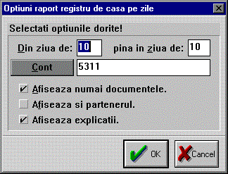 Dupa apelarea comenzii, pe monitor apare o fereastra de dialog ca în Figura 79. Stabiliti ziua de început si ziua de sfârsit pentru care doriti sa obtineti raportul. Completati în câmpul "Cont" codul contului de casa.