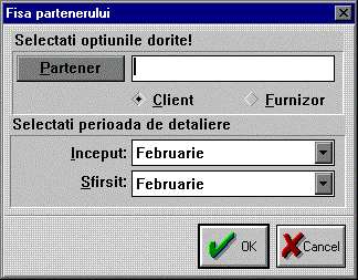 Selectati în câmpul "Partener" partenerul pentru care doriti sa obtineti raportul. Pentru a selecta partenerul apasati cu mouse-ul butonul "Partener" si din lista partenerilor ce se deschide selectati partenerul dorit. Bifati câmpul "Client" sau "Furnizor" în functie de fisa pe care trebuie sa o obtineti. Programul, implicit propune fisa pentru luna curenta. Daca doriti fisa partenerului pentru o alta perioada, selectati luna de început si luna de sfârsit pentru care doriti raportul. Apasati cu mouse-ul butonul "OK" sau tasta "Enter" pentru a obtine fisa partenerului cu optiunile selectate de dumneavoastra.