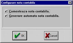Prin aceasta comanda stabiliti daca progamul "Registre" va genera automat notele contabile pe care le trimite în programul "Balanta". Apealarea comenzii duce la aparitia pe monitor a unei ferestre de dialog ca în Figura 85.
