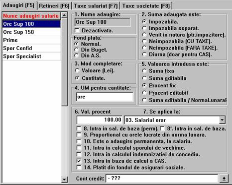 In afara salariului tarifar, in alcatuirea venitului brut pot apare si alte sporuri (drepturi salariale), denumite in continuare adaugiri. Unul din avantajele programului Personal - Salarizare este tocmai posibilitatea utilizatorului de a-si defini singur adaugirile, in maniera in care doreste.