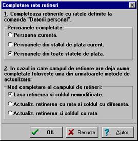Se pot completa manual sau automatizat, cu valorile din luna anterioara sau cu procent din salariul tarifar sau din alte valori;