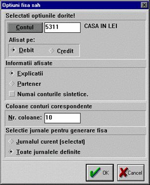 Raportul fisa sah se obtine prin comanda "Fise cont - Fisa sah" aflat în meniul "Rapoarte". Dupa apelarea comenzii, pe monitor apare o fereastra de dialog ca în Figura 83.