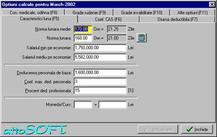 - caracteristicile lunii curente (norma lunara medie, norma lunara, salariul minim pe economie, salariul mediu pe economie, diurna deductibila, deducerea personala de baza, etc.)