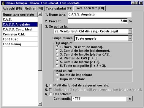 Ca si taxele platite de angajat, taxele platite de angajator (de unitate) sunt usor de definit si/sau de modificat in conditiile modificarii legislatiei. Valorile acestor taxe pot fi vizualitate atat in centralizatoare speciale, cat si in statele de plata, pentru fiecare angajat (bineinteles, daca se doreste acest lucrul).