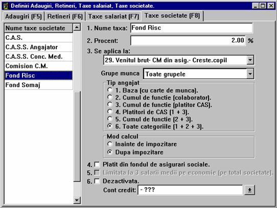 Taxele platite de angajat sunt astfel definite in program incat sa poata fi usor definite si/sau modificate de catre utilizator. La definirea unei astfel de taxe se specifica care este procentul taxei, la ce se aplica, la ce categorie de angajat se aplica (cu carte de munca sau colaborator), daca se calculeaza inainte sau dupa impozitare, eventual de unde se plateste etc.