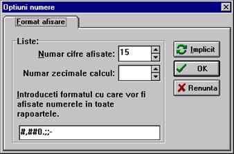 Este comanda prin care puteti stabili formatul numerelor ce vor apare în rapoarte. Dupa ce dati comanda, pe ecran apare o fereastra de dialog ca în Figura 84.